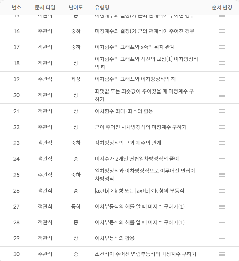 위 교재 PDF에 30문항은 아래 유형/단원 오름차순으로 정리 되어있습니다.